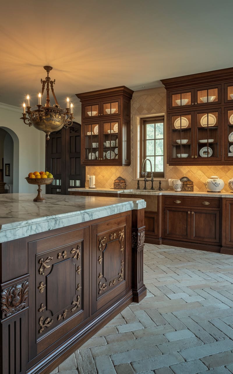 A warm glow, cast by a candelabra chandelier, kisses the polished marble of a grand kitchen island, its dark wood carved with intricate flourishes echoing a bygone era. The herringbone brick floor leads the eye to richly stained cabinetry, each glass door revealing a curated collection of porcelain. This space, a testament to timeless elegance, hums with the promise of a feast, a quiet retreat into the heart of a Tuscan villa.