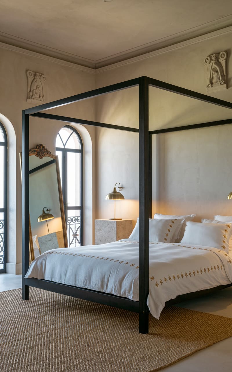 The room, bathed in a soft, diffused glow, whispers of a bygone era with its muted plaster walls and arched windows framing a distant world. A minimalist four-poster bed, stark and modern, stands as a bold counterpoint to the room’s classical bones, its dark frame echoing the ironwork of the balcony beyond. A golden mirror catches the subtle luminescence, doubling the space and hinting at hidden depths, while the simple, textured rug anchors the room in a quiet, grounded elegance.