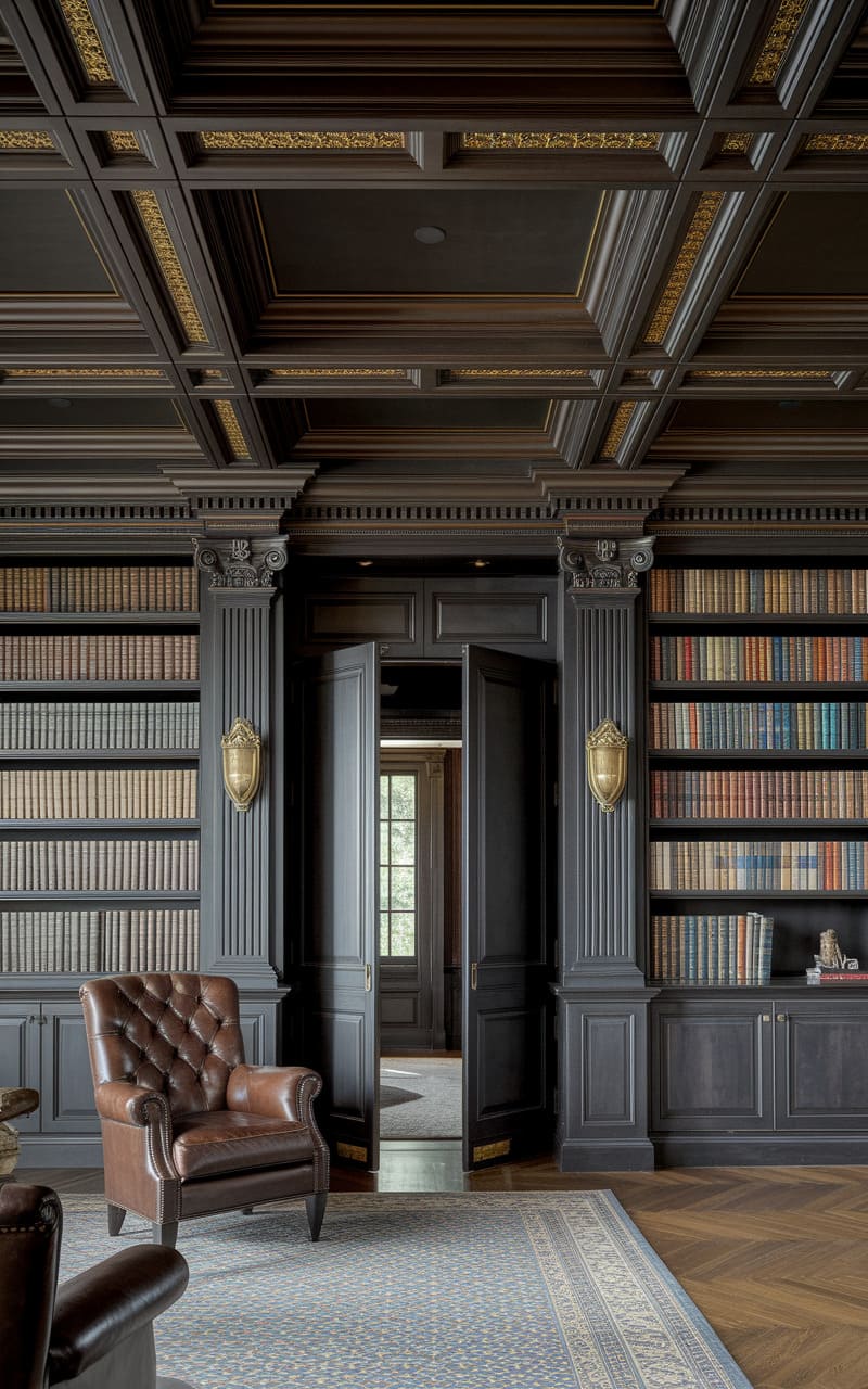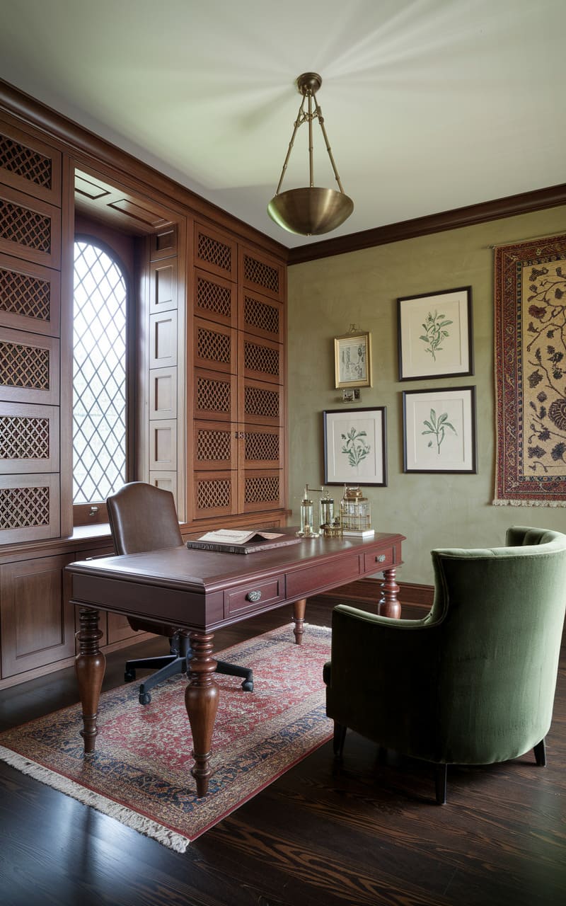 14. Sophisticated Renaissance-Influenced Home Office with Walnut and Leather Details