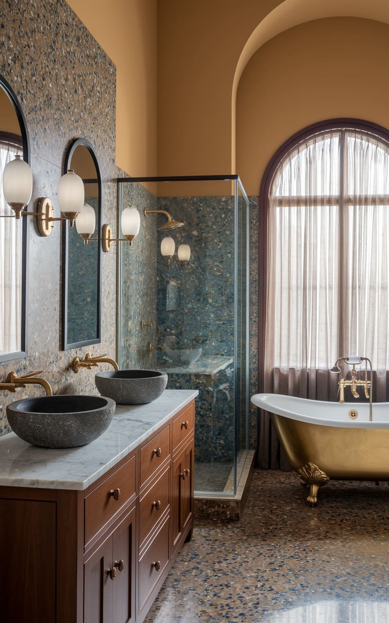 Bathed in the warm glow of a hidden source, this bathroom whispers of Florentine grandeur. Twin basins of carved stone sit atop a rich, wooden vanity, flanked by orbed sconces that echo the room’s arched architecture. A gilded, claw-footed tub gleams against the far wall, framed by softly draped curtains, while the shower’s speckled glass reflects the playful terrazzo floor, a mosaic of earthy tones.