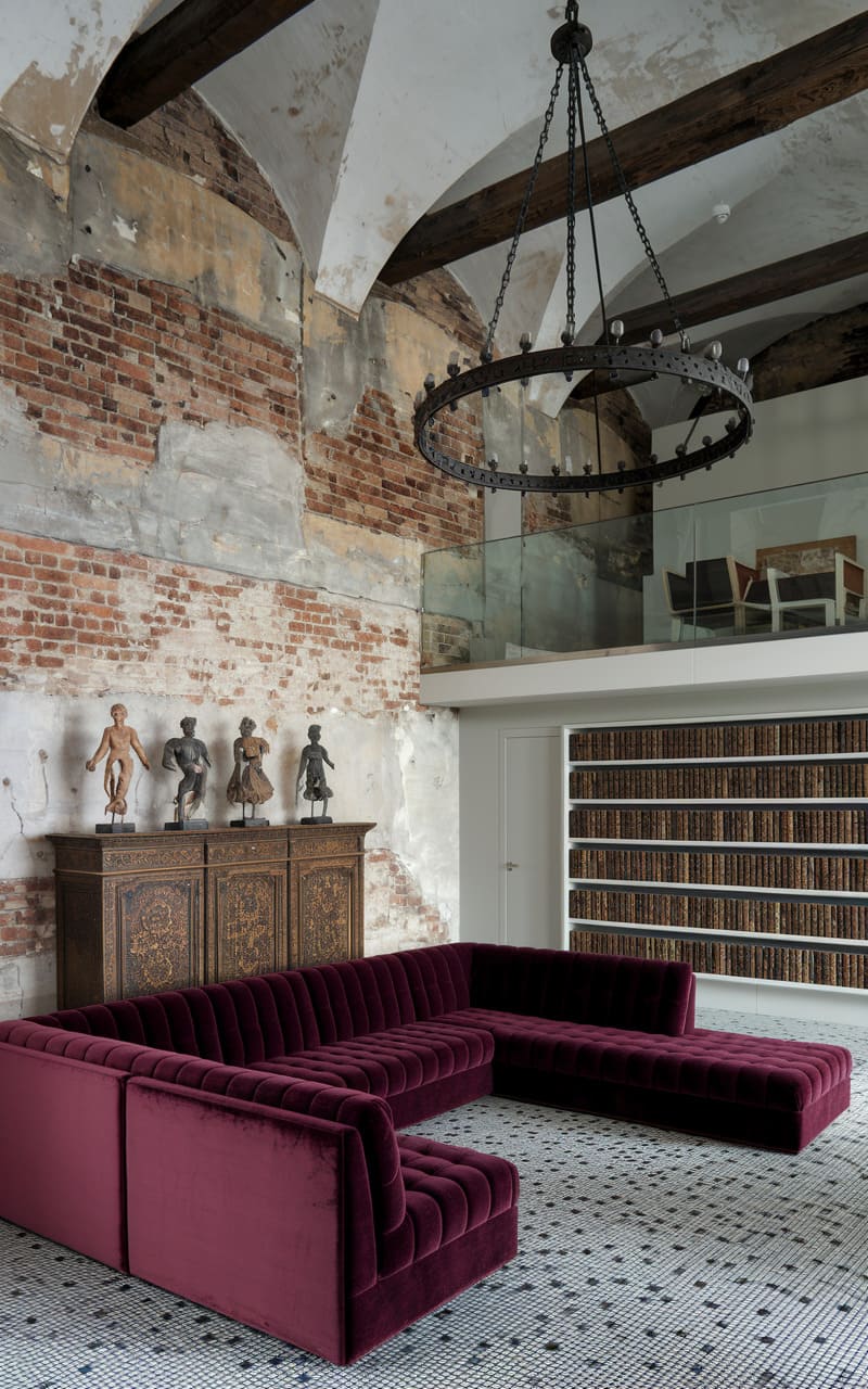 The weight of ages settles in this grand hall, where raw brick whispers tales of forgotten masons beneath the lofty, vaulted ceiling. A plush, garnet sectional anchors the space, its modern lines a stark contrast to the timeworn texture of the walls. Above, a skeletal chandelier casts a dramatic, almost theatrical shadow, while a glass partition hints at a hushed, contemporary study beyond. The room feels like a stage set, a carefully curated blend of historical grandeur and intimate comfort, where time itself seems to pause.