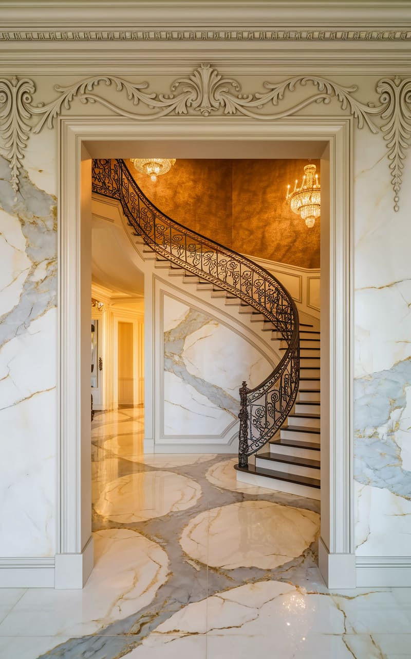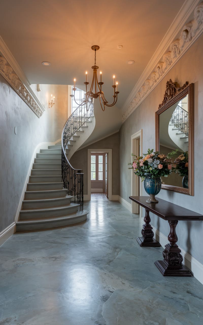 A whisper of candlelight flickers across the cool, stone floor, illuminating the elegant curve of a grand staircase. Ornate plasterwork dances along the walls, framing a glimpse of the outside world through a distant doorway. A gilded mirror reflects the scene, doubling the drama of the space and the delicate blooms arranged on a polished console, all anchored by the warm glow of a chandelier above.