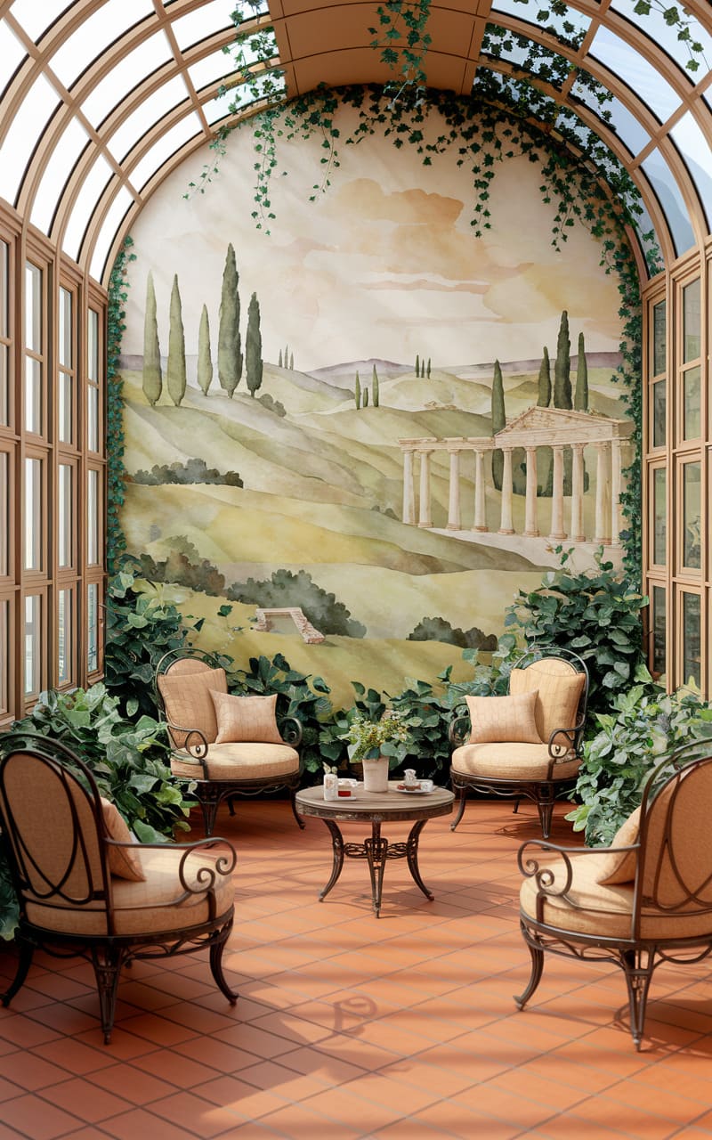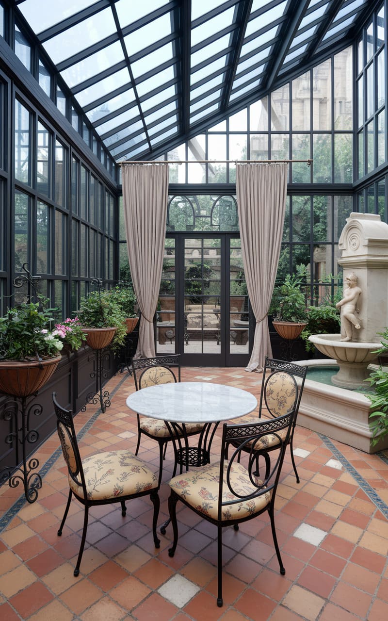 Bathed in a diffuse, ethereal glow filtering through a glass canopy, this intimate courtyard whispers tales of Florentine gatherings. Terracotta tiles, warmed by the day’s embrace, anchor the space, while a whisper of water from a cherub-adorned fountain adds a melodic counterpoint to the quiet rustle of potted greenery. The wrought iron furniture, delicate yet sturdy, invites whispered conversations around a marble-topped table, all framed by the dramatic lines of black-framed glass and the soft drape of neutral curtains – a secret garden where time slows and artistry reigns.