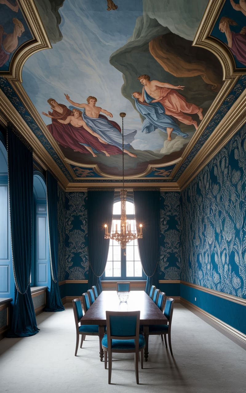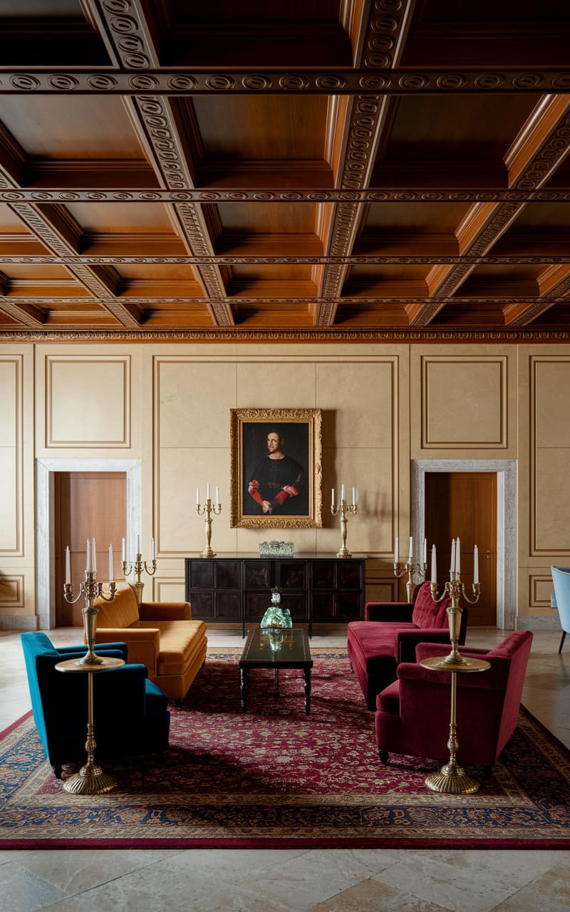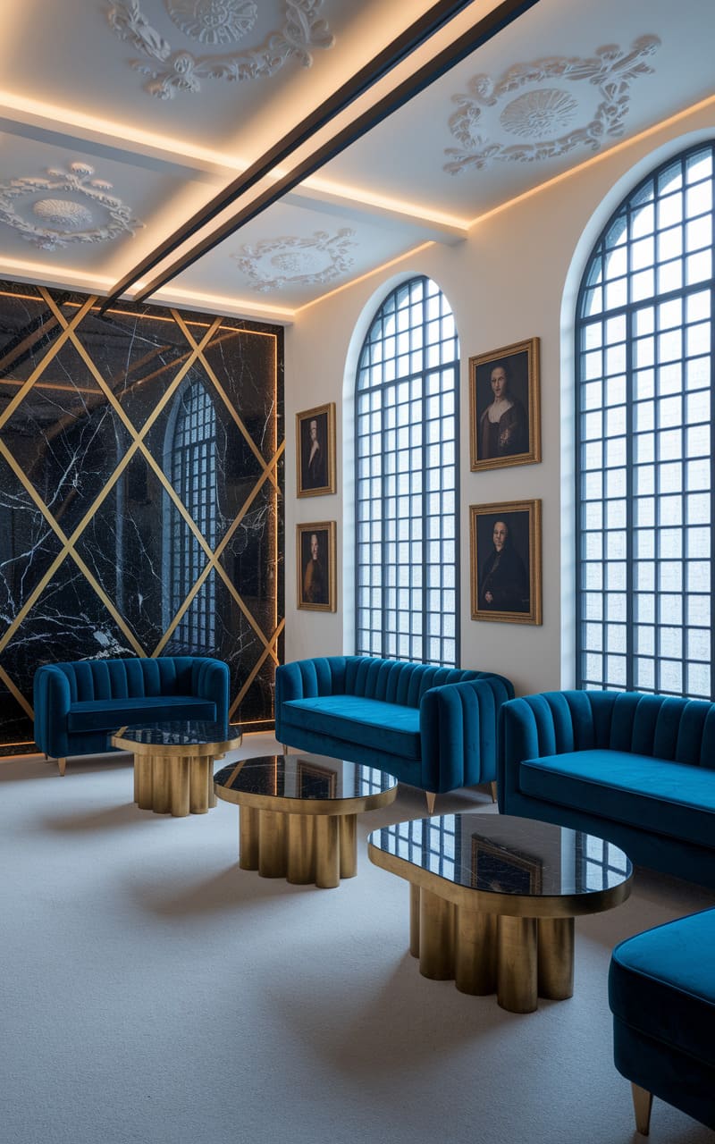 Imagine stepping into a stage set for a Medici drama, where the air hums with unspoken secrets. Velvet settees in a shade of deep sapphire, like captured twilight, invite you to rest while framed portraits observe with knowing eyes. The walls, a canvas of soft creams, are punctuated by arched windows, each pane a tiny, gridded world. A dark, veined panel, laced with gold, reflects the room’s opulence, while the ceiling, a whisper of ornate plasterwork, hints at grander stories unfolding above. It’s a space where time seems to pause, caught in the elegance of a bygone era.