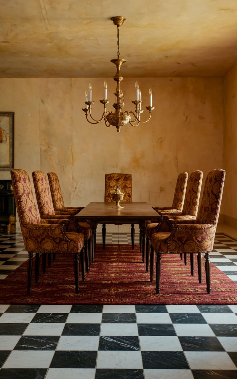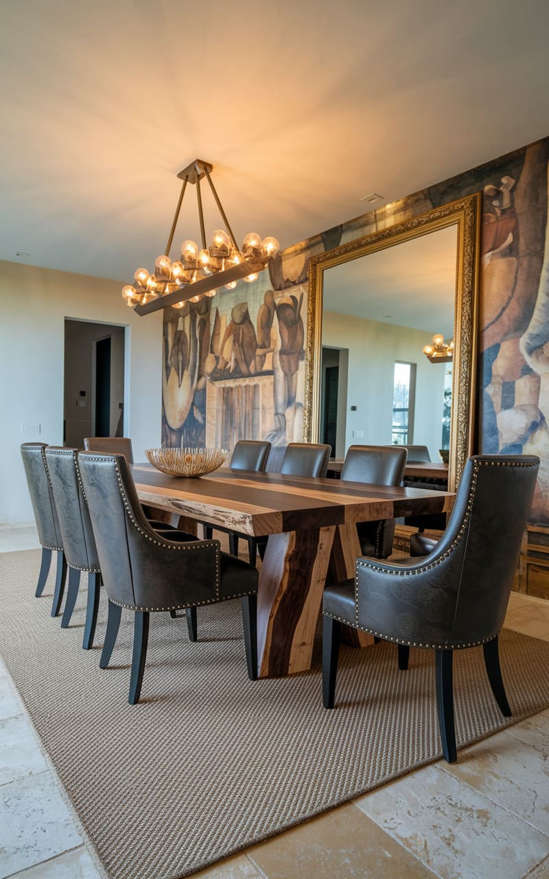 Whispers of the Italian Renaissance linger in this dining space, where a raw-edged timber table anchors the room, its heft softened by plush leather chairs. A mural, faded as if kissed by time, echoes the grand narratives of old, while a gilded mirror reflects the warm glow of a multi-bulb chandelier, casting a theatrical light on the scene. The textured rug underfoot muffles the clatter of imagined gatherings, hinting at feasts and whispered secrets shared in this elegantly aged setting.