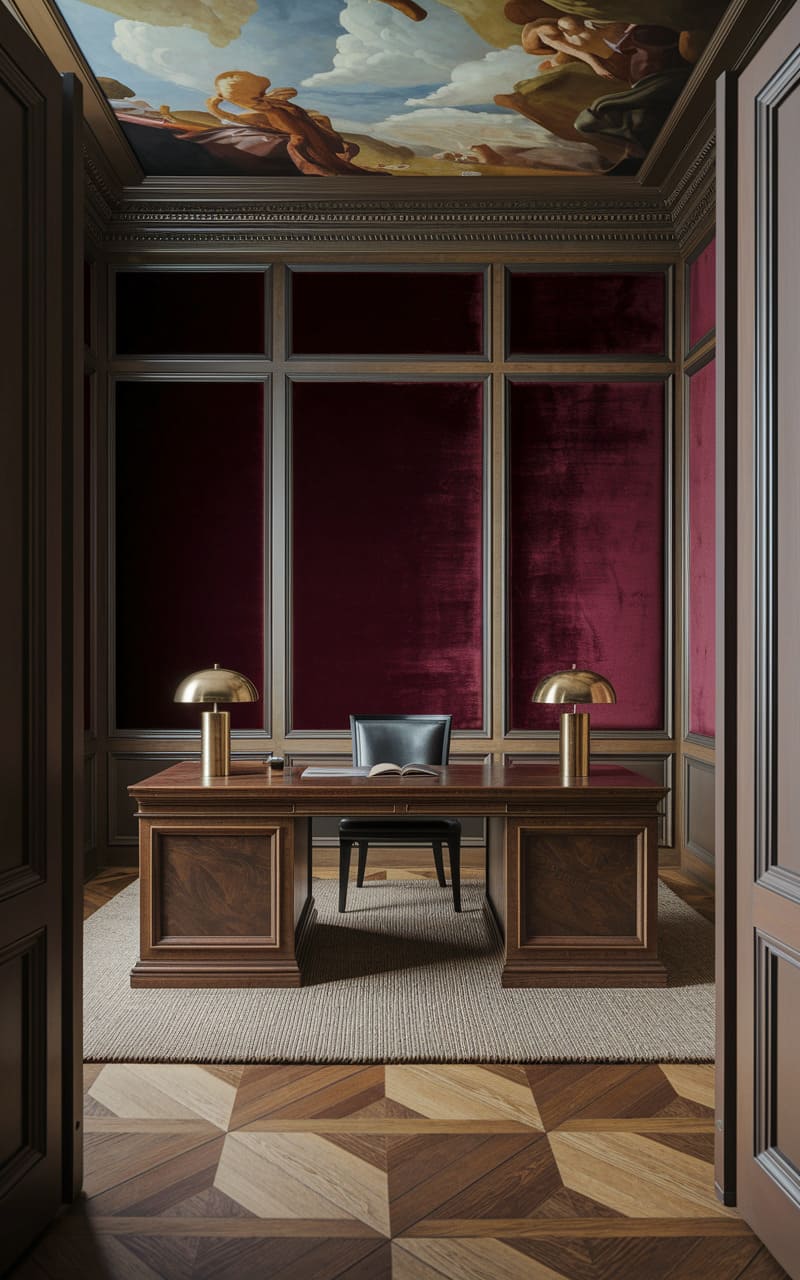 The room whispered of opulent secrets, a Renaissance dream captured in rich, velvety burgundy panels framed by dark wood, all beneath a painted sky teeming with cherubs. Twin brass lamps cast a warm glow on a substantial desk, its polished surface reflecting the intricate parquet floor, while a single leather chair waited patiently, a silent confidante in this private, theatrically staged retreat.