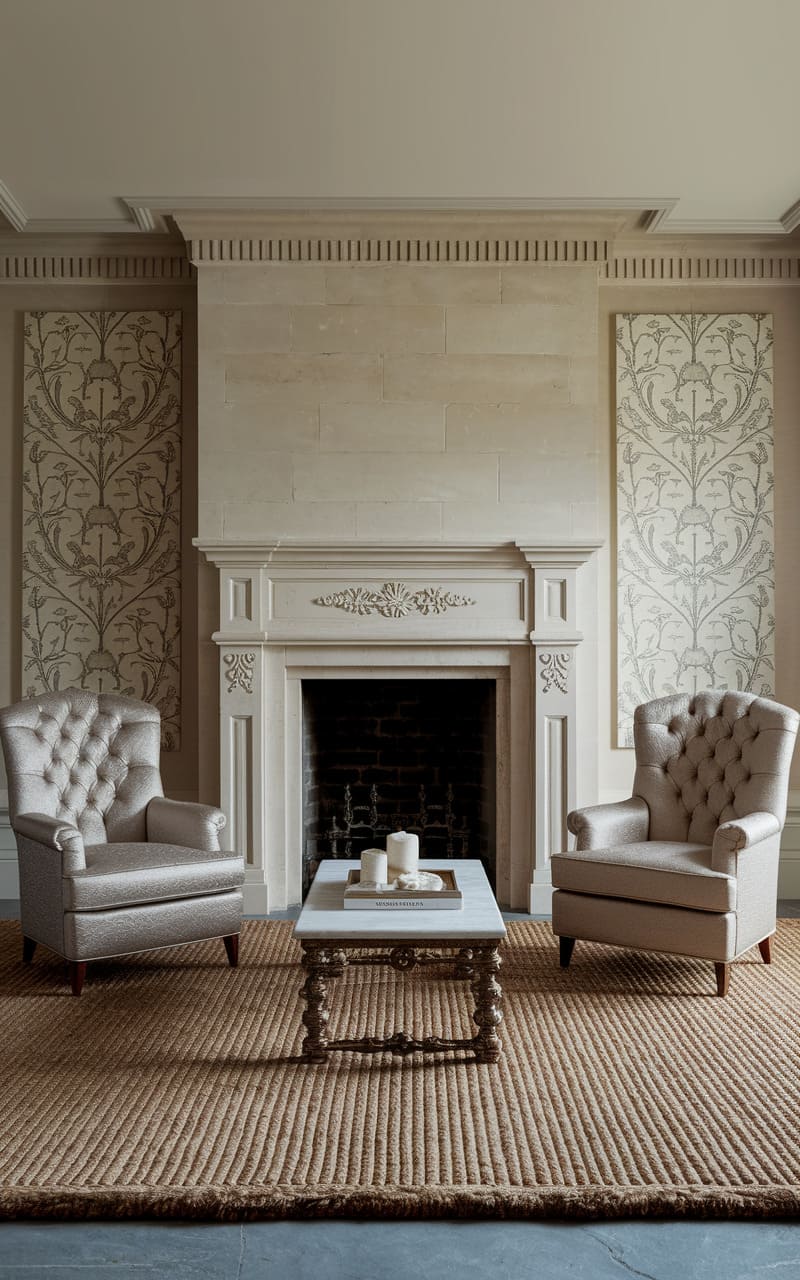 Bathed in the soft glow of a hidden window, this intimate space whispers tales of bygone elegance. Two plush, tufted armchairs flank a simple, yet stately, fireplace carved from pale stone, its mantle adorned with delicate floral reliefs. A low, ornate table anchors the scene, while patterned tapestries on either side of the hearth lend a touch of faded grandeur, all resting upon a textured, earthy rug.