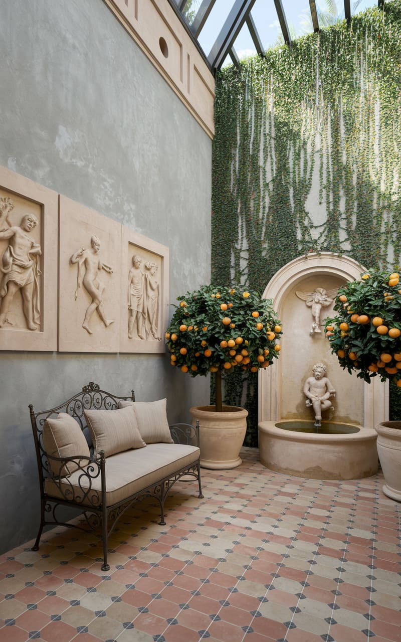 Stepping into this hidden courtyard, one is transported to a Florentine villa, where terracotta tiles whisper tales of ancient footsteps and bas-reliefs of frolicking figures dance along the weathered walls. A pair of stout citrus trees, bursting with ripe fruit, flank a cherub-adorned fountain, their glossy leaves mirroring the verdant cascade of vines that tumble from a glass-paneled ceiling, bathing the space in a soft, diffused glow. A wrought-iron bench, its cushions inviting repose, completes the scene, a quiet haven of classic elegance.
