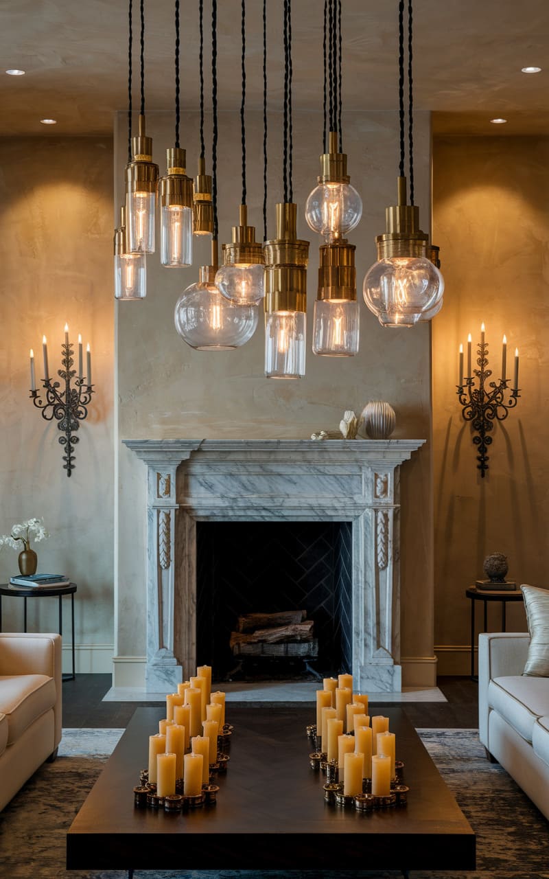 A warm glow from multiple pendant lights, each a brass-and-glass marvel, dances across the textured walls of this Renaissance-inspired haven. Below, a marble-mantled fireplace promises cozy evenings, while rows of candles line the coffee table like golden sentinels, casting flickering reflections that soften the room’s elegant formality. Ornate sconces flank the hearth, their intricate metalwork adding a touch of gothic drama to the otherwise soft palette, inviting one to imagine whispered conversations and crackling flames.