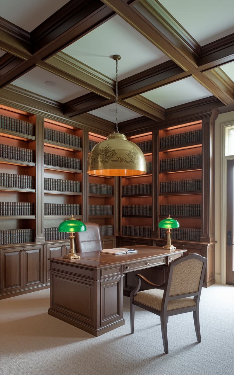 34. Elegant Renaissance Study with Library Lamps and Brass Pendant Lights