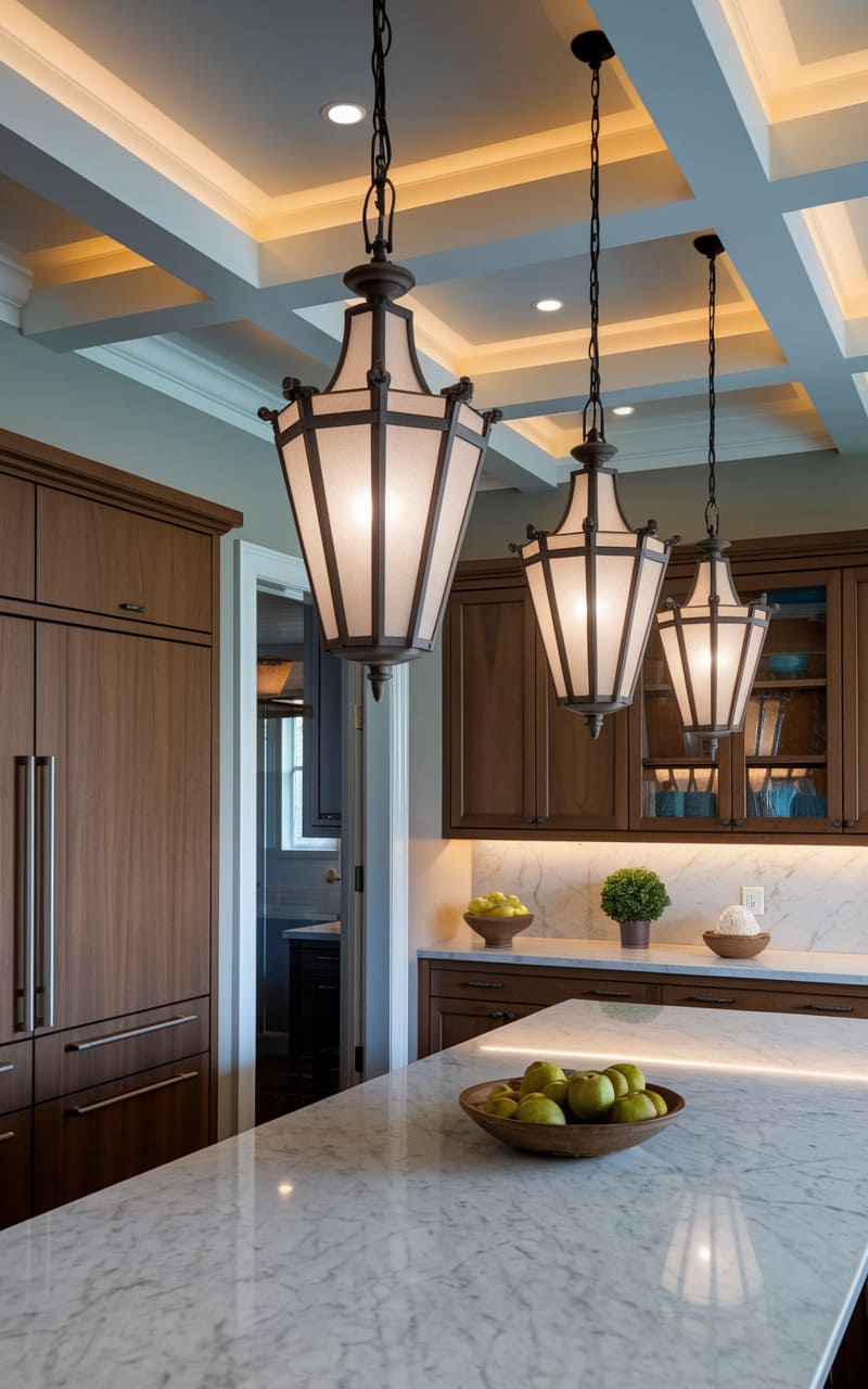 Three lanterns, like elegant, caged fireflies, hang above a gleaming marble expanse, their soft glow catching the edges of a coffered ceiling lined with a hidden, warm radiance. Dark, substantial cabinetry anchors the space, hinting at hidden treasures, while the room’s overall symmetry and clean lines suggest a modern interpretation of classical grandeur, a stage set for a quiet, intimate gathering.