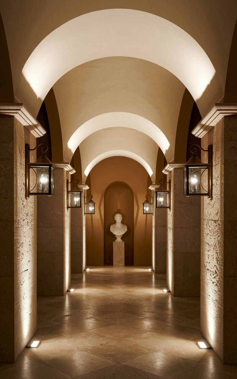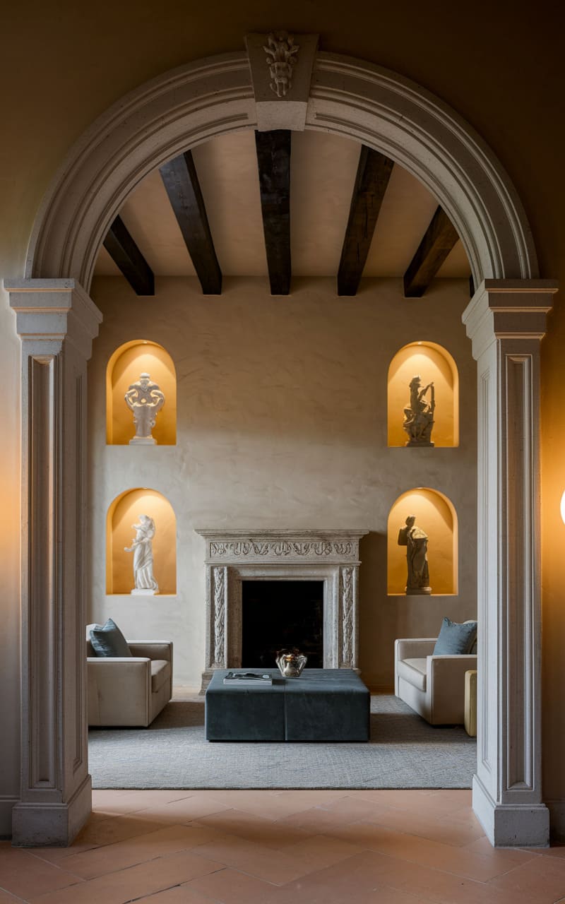 38. Dramatic Renaissance Hallway with Arched Niches and Soft Uplighting