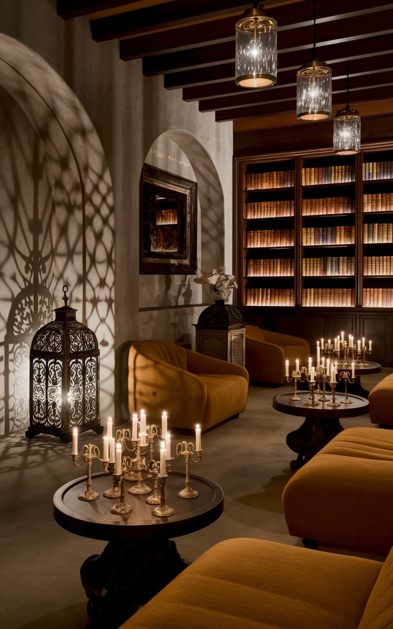 Bathed in the warm glow of countless candles, the room whispered tales of a bygone era. Arched alcoves, casting intricate shadows from a filigreed lantern, framed plush, ochre seating that invited quiet contemplation. A wall of aged tomes, illuminated from within, promised untold stories, while the rough-hewn beams above hinted at a history far richer than the gilded candelabras scattered across the low tables. It was a space where time seemed to slow, a haven for whispered secrets and the crackle of burning wax.