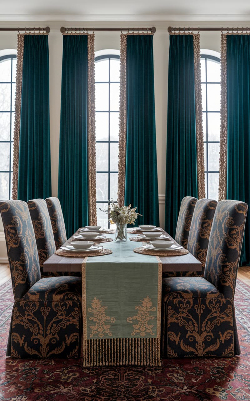 43. Regal Renaissance Dining Room with Tapestry Upholstered Chairs and Heavy Drapes