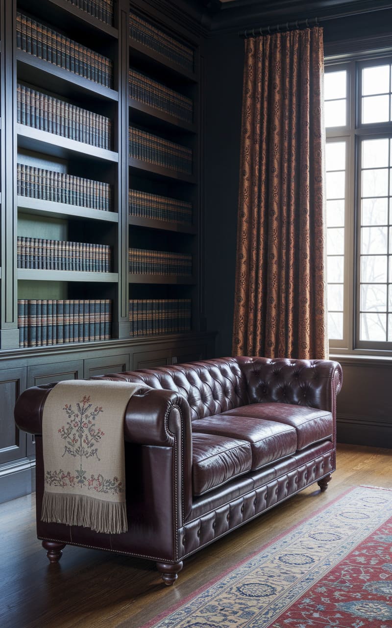 In a hushed, book-lined chamber, a tufted leather chesterfield, the color of aged port wine, rests upon a worn Oriental rug, its fringed throw whispering tales of forgotten voyages. Dark, imposing shelves, crammed with the weight of centuries, flank a tall window where a silken drape, woven with threads of rust and gold, catches the pale glow of a hidden sky. The room breathes with the quiet dignity of a scholar’s retreat, a place where time slows and stories unfold in the shadows.