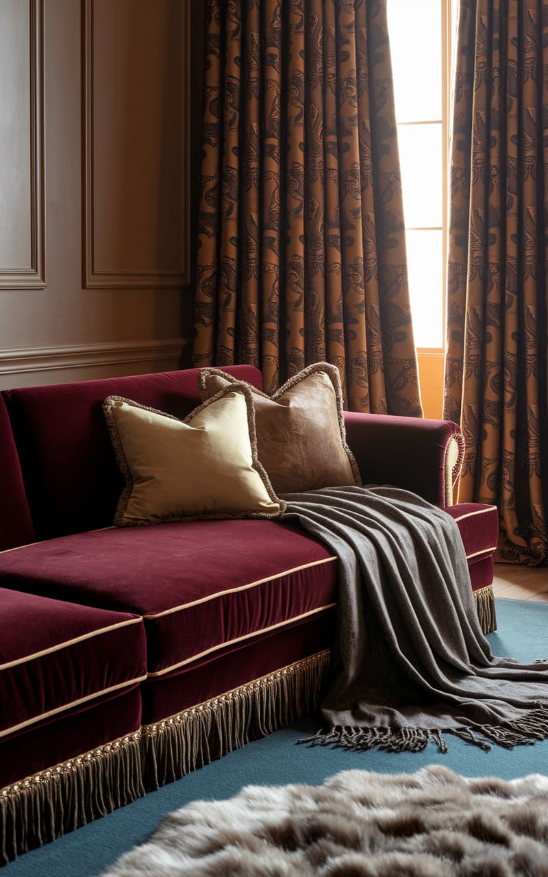 The room hummed with a quiet opulence, a garnet velvet sofa anchoring the space with its gold-trimmed fringe and a pair of plush cushions, one luminous cream, the other a rich caramel. A charcoal throw draped languidly across its arm, suggesting a moment of comfortable repose. Behind, heavy drapes, patterned in a muted ochre and umber, framed a tall window, hinting at a world beyond while keeping the room in a hushed, intimate embrace. A soft, fur-like rug lay pooled on the cool blue carpet, adding a touch of wildness to the otherwise stately scene.