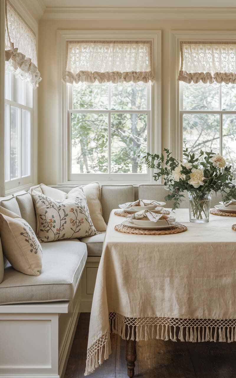 47. Charming Renaissance-Inspired Breakfast Nook with Linen Cushions and Lace Drapes