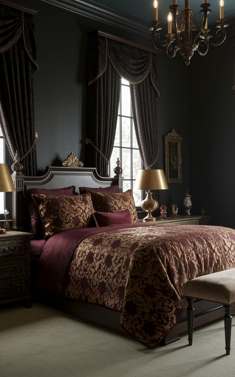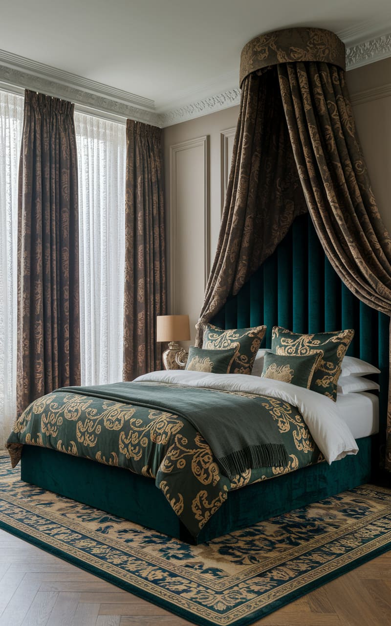 49. Contemporary Renaissance Master Suite with Layered Fabrics and Ornate Bed Linens