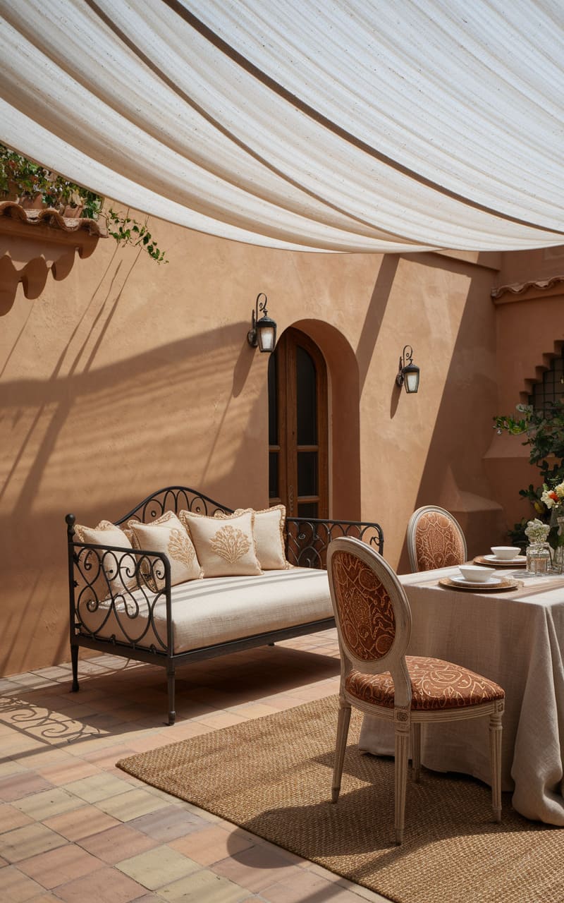 50. Serene Renaissance-Inspired Outdoor Patio with Woven Linens and Embroidered Cushions