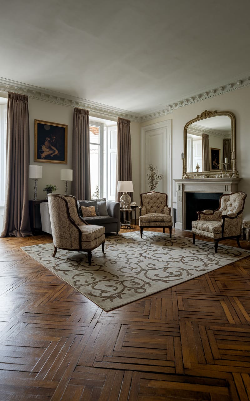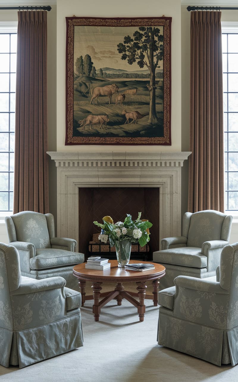 Four plush armchairs, like watchful sentinels, gather around a low, round table, their soft fabric echoing the muted tones of the pastoral tapestry hanging above the imposing mantle. The scene is a tableau of quiet elegance, where the promise of whispered conversations hangs in the air, the rhythmic pleats of the drapes framing the tall, multi-paned windows and lending a sense of timeless drama to the intimate gathering space. The room feels steeped in history, a place where stories are shared and secrets are kept, the hearth a silent witness to moments unfolding in its quiet embrace.