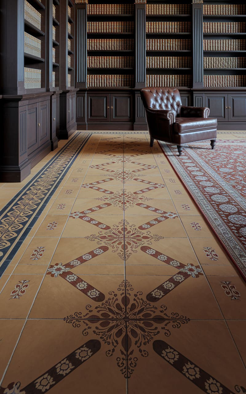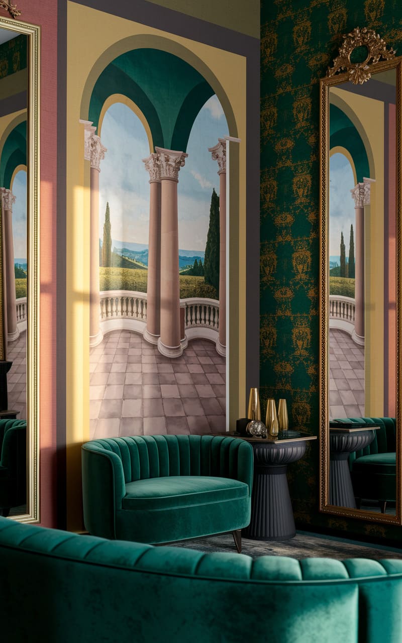 20. Stylized Renaissance-Influenced Lounge with Velvet and Geometric Marble Patterns