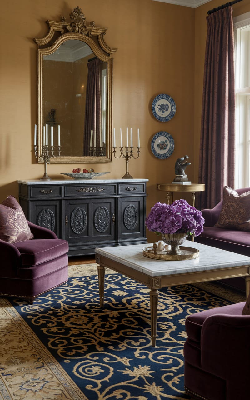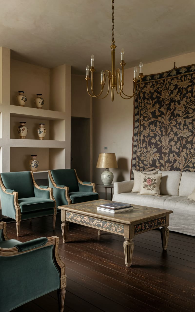 21. Layered Renaissance-Inspired Living Room with Textured Plaster and Velvet Upholstery