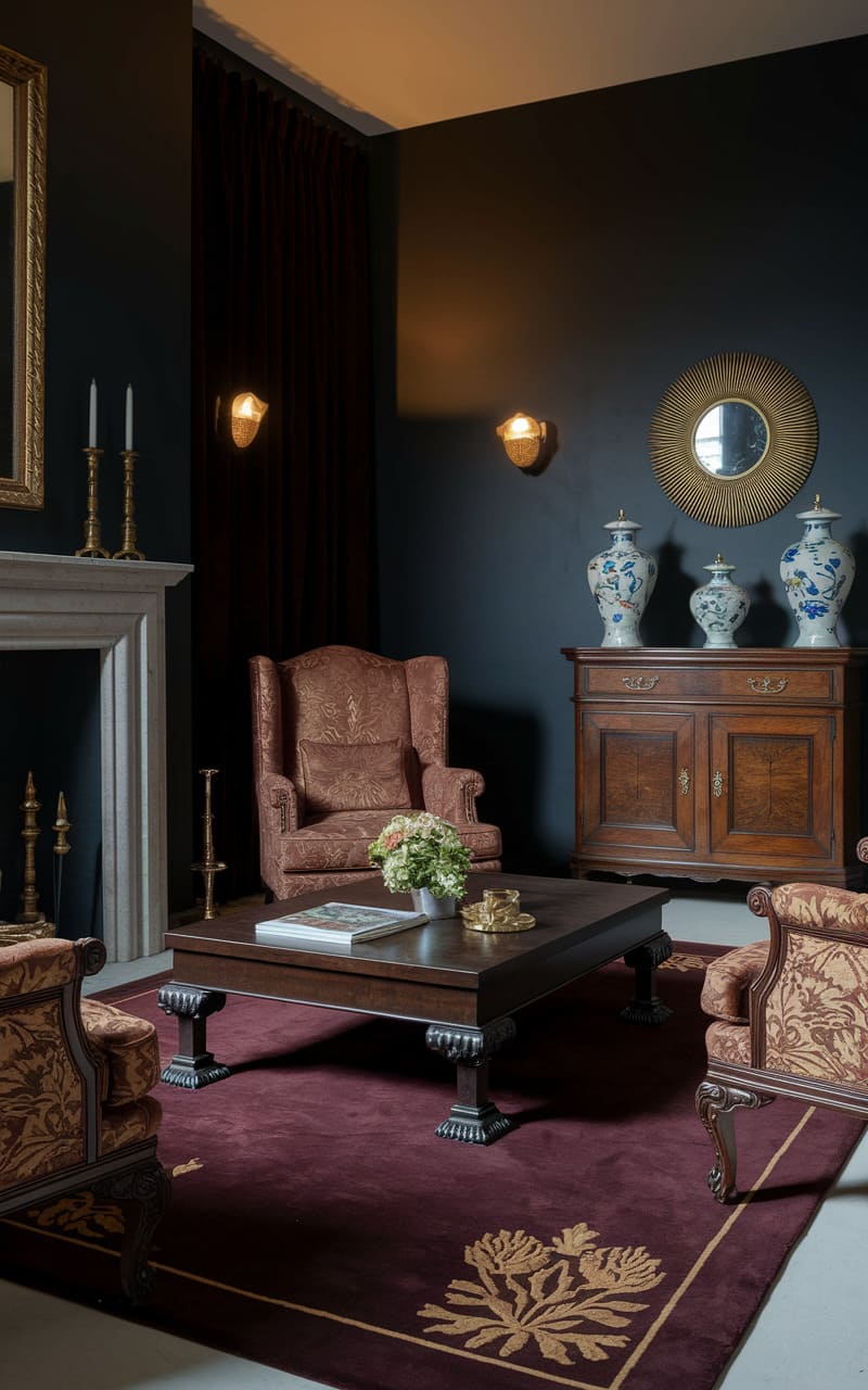 Crimson walls, deep as a cardinal’s robe, enveloped the room in a theatrical embrace. Gold trim, like precious thread, traced the architectural lines, drawing the eye upwards to a medallion ceiling and a chandelier that dripped with gilded light. Twin settees, plush and regal, faced each other across an intricate rug, their velvet surfaces reflecting the flickering glow from a marble fireplace. Portraits, framed in ornate gold, stood sentinel, their painted eyes hinting at the secrets held within this jewel-toned sanctuary.