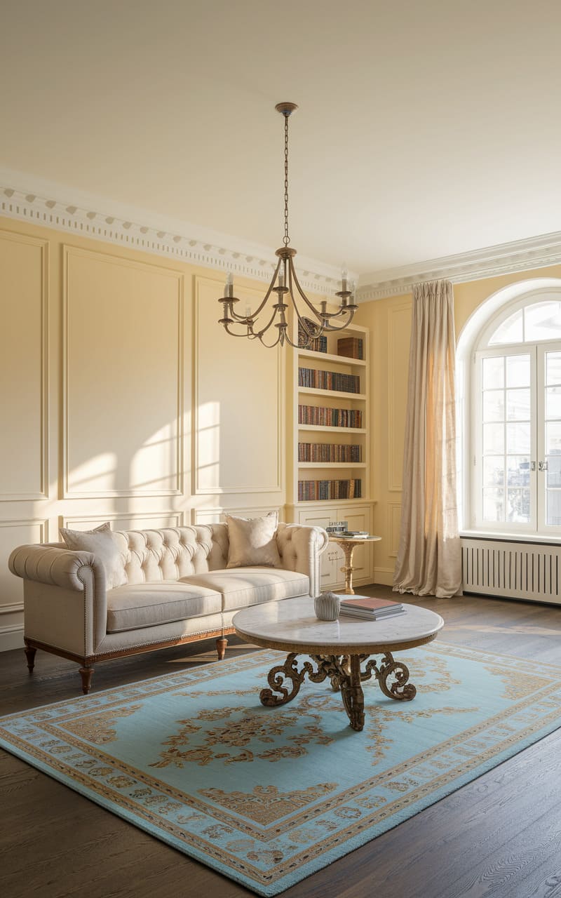 121. Timeless Ivory and Soft Gold Renaissance-Inspired Living Room with Deep Blue Accents
