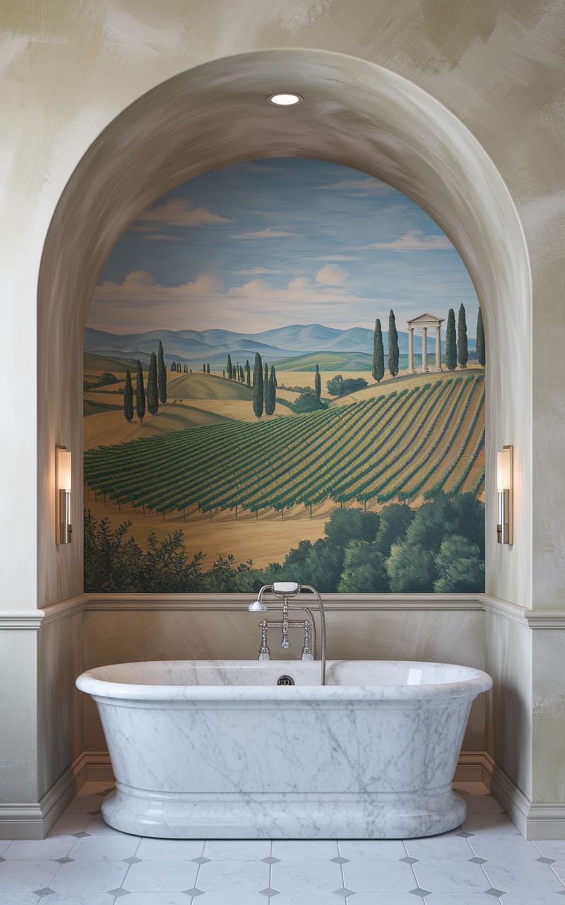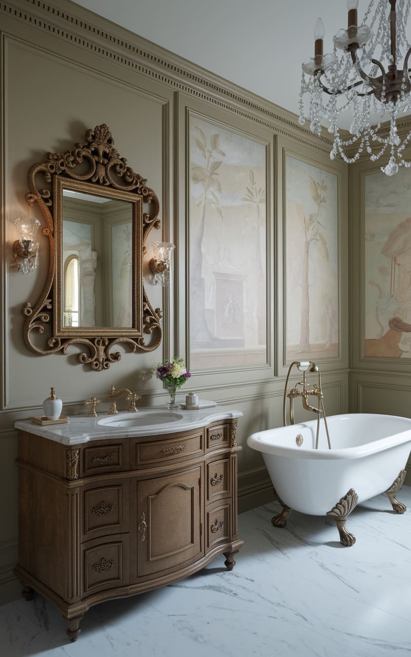 Enclosed in a serene palette of muted tones, this bathing chamber evokes a Renaissance retreat. Elaborate paneling frames delicate murals, hinting at pastoral scenes, while a grand, gilded mirror reflects the gentle sparkle of a crystal chandelier. A claw-footed tub, poised for indulgence, anchors the space, its polished brass fixtures glinting beside a vanity crafted with the same intricate detail, suggesting a place where ablutions become an artful ritual.