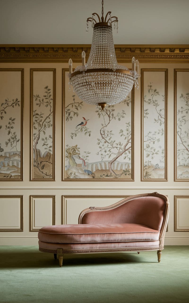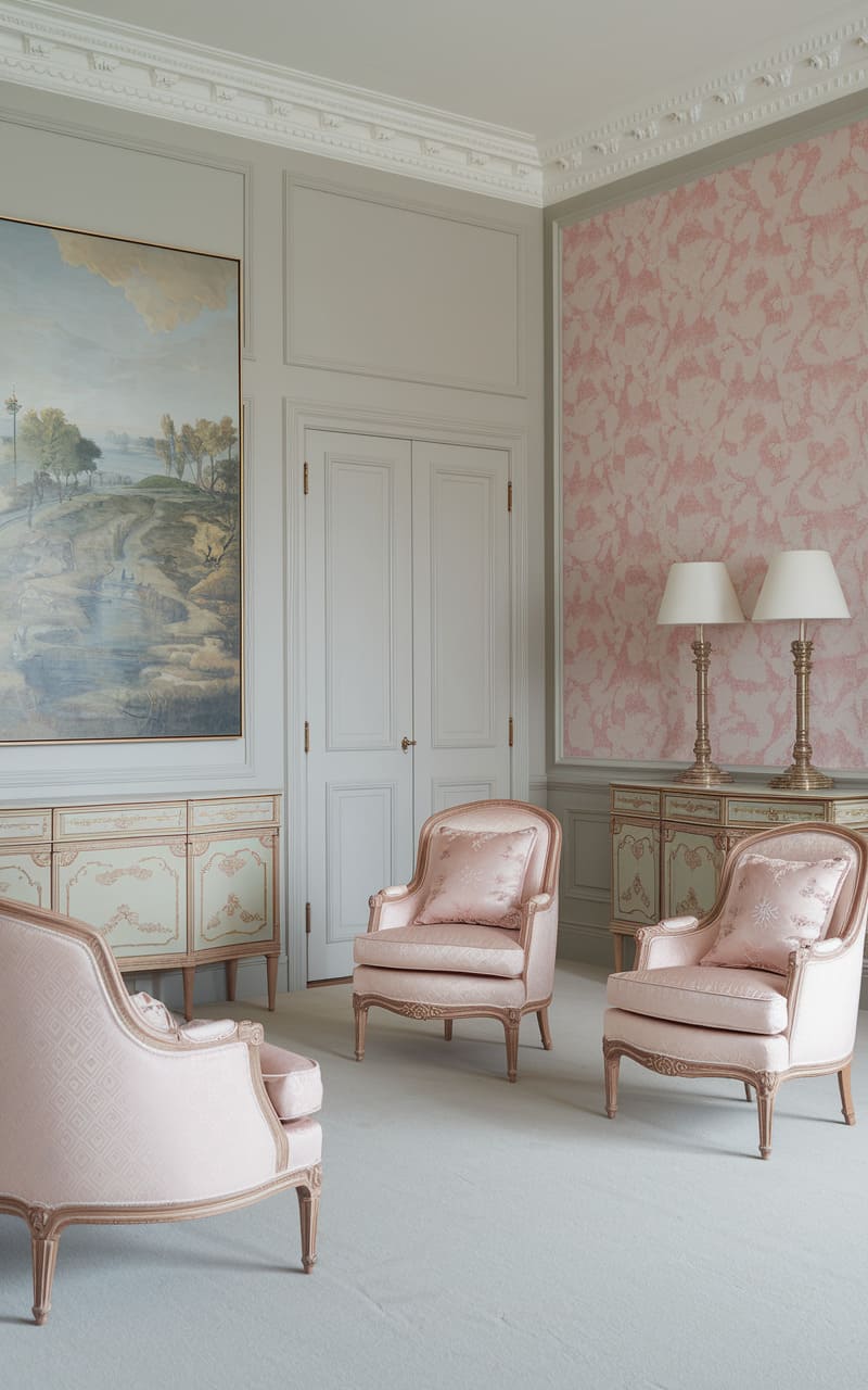 The room whispered of a grand estate, its walls a symphony of soft hues, where a hazy landscape painting echoed the delicate pinks of the damask wallpaper and the plump armchairs. The ornate plasterwork ceiling, a crown of intricate detail, seemed to hold the very breath of history, while twin lamps glowed with a warm, intimate light, casting a gentle sheen on the polished surfaces of the matching sideboards. A sense of quiet elegance permeated the space, a haven of refined taste where time seemed to slow, inviting contemplation and repose.