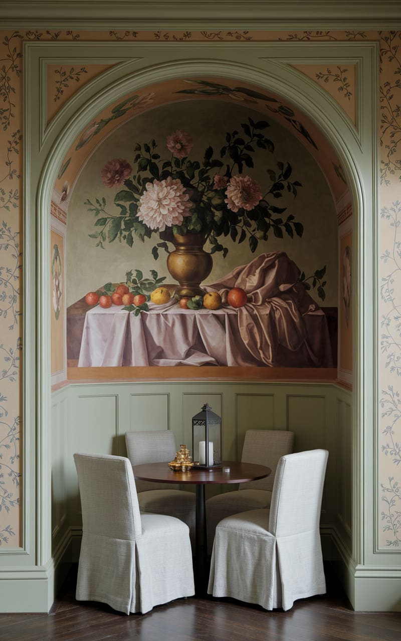 A whisper of sage green washes over this bedchamber, where a four-poster, its carvings hinting at Florentine artistry, stands draped in silken folds, promising slumber amidst a palette of serenity. Delicate botanical patterns climb the walls, mirroring the soft glow of twin sconces and the muted sheen of the bedding. The room, a haven of quiet refinement, breathes with the hushed elegance of a Renaissance portrait, inviting a retreat from the clamor of the world into a realm of tranquil beauty.