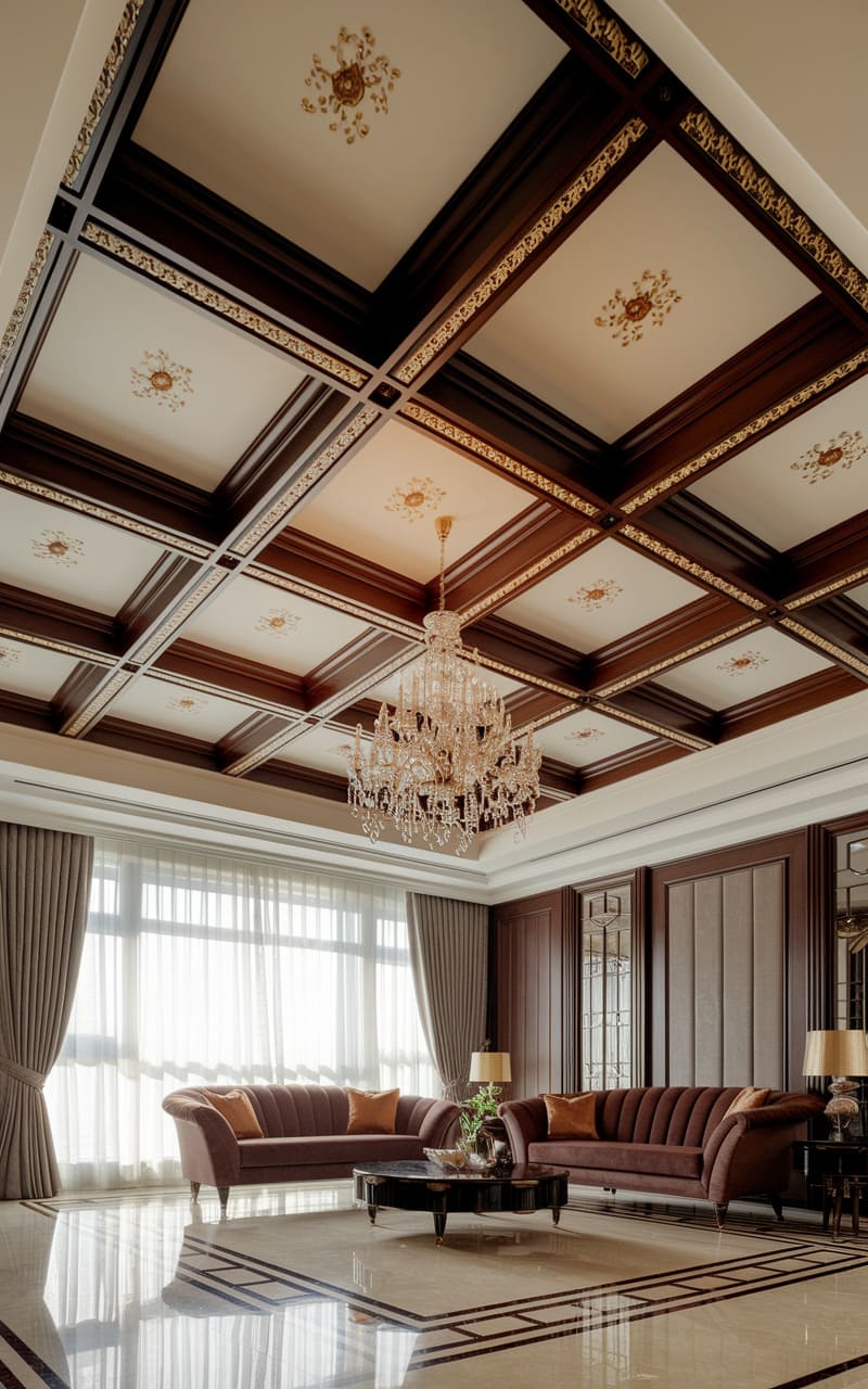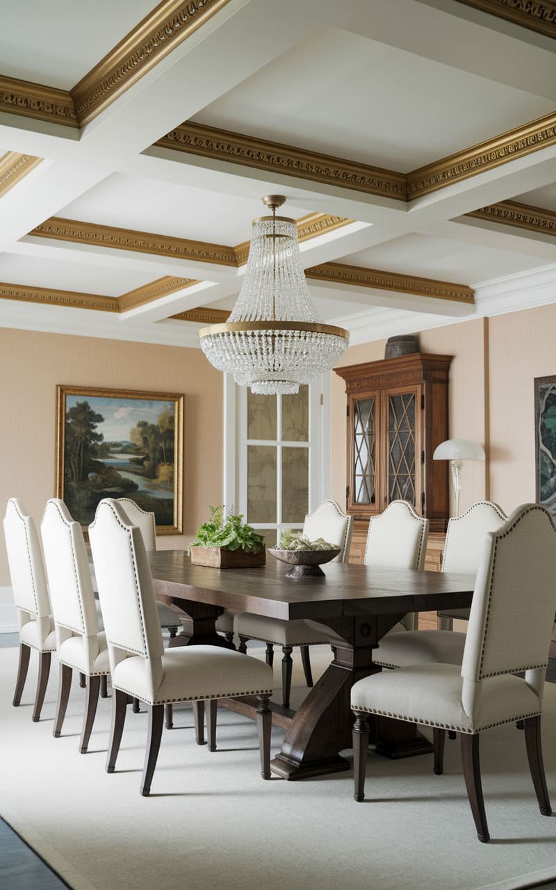 A grand, yet subtly inviting, dining room unfolds with a sense of quiet opulence. A crystal chandelier, like a frozen cascade, hangs above a substantial wooden table, ready for a feast. The coffered ceiling, trimmed with a touch of gilded elegance, echoes the room’s refined formality, while the soft, neutral tones of the walls and plush chairs create a serene backdrop for intimate gatherings and whispered conversations, all illuminated by a gentle, diffused glow.
