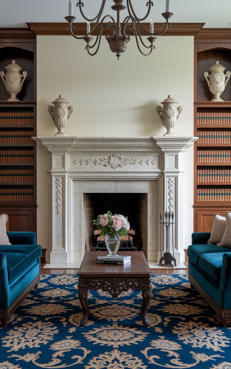 11. Modern Renaissance Living Room with Marble and Dark Wood Accents
