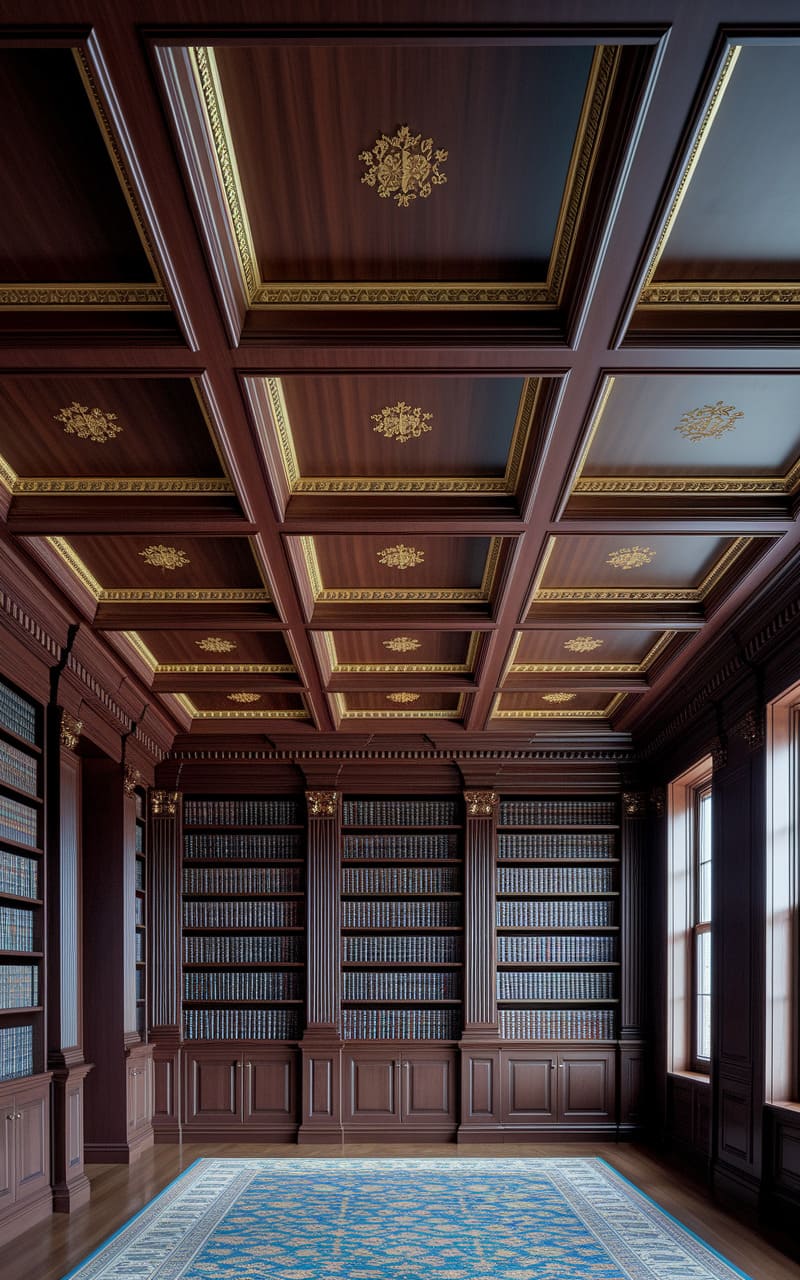 A scholar’s retreat, steeped in the deep hues of a twilight sky, reveals a library where rows of aged spines line the walls, a testament to countless untold stories. The rich, dark wood of the desk, worn smooth by years of contemplation, anchors the room, its warm glow mirrored in the twin brass lamps that stand guard over a lone, open book. Overhead, a celestial pattern, painted in gold against the deep blue ceiling, hints at cosmic connections, while the patterned rug underfoot adds a touch of worldly comfort to this haven of intellectual pursuit.