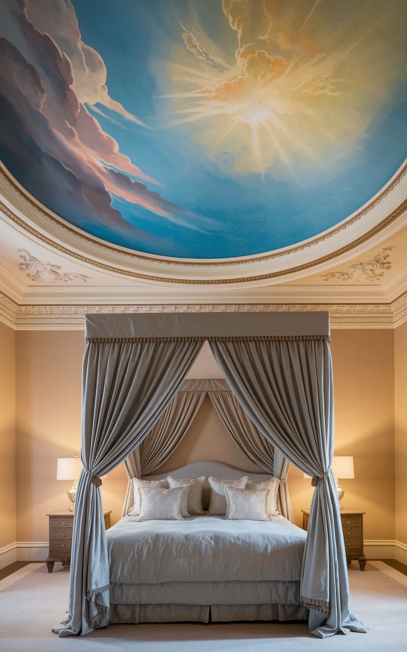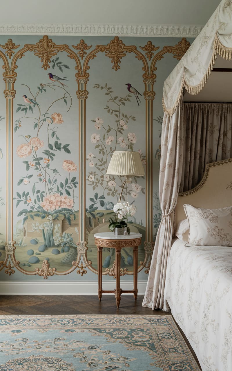 133. Minimalist Bedroom with Renaissance-Style Fresco Accent Wall and Canopy Bed