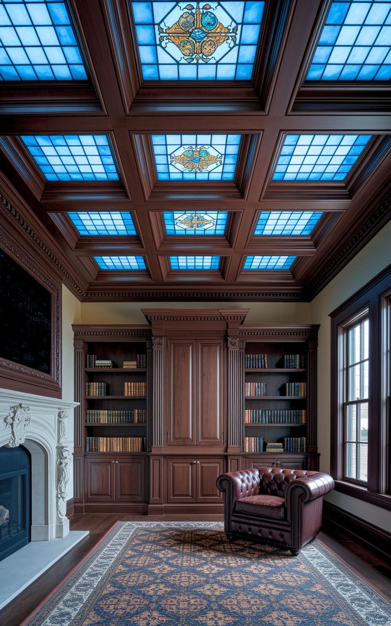 Imagine stepping into a grand salon where the weight of history settles around you. A coffered ceiling, dark and dramatic, looms above, while a crystal chandelier drizzles light onto plush leather sofas. The walls whisper tales of frescoes, and a carved mantle stands sentinel over a hearth that promises warmth. Through arched windows, a misty panorama hints at distant lands, and the muted tones of the room seem to hold the echoes of whispered secrets and elegant gatherings.