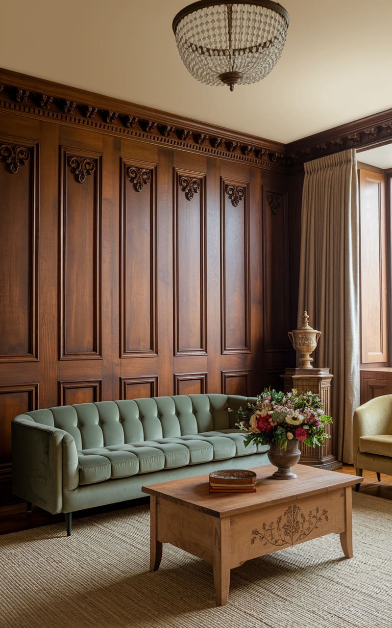 Imagine stepping into a grand salon where time seems to slow. A plush, tufted sofa in a rich olive green beckons you closer, its velvety texture mirroring the deep tones of the ornate rug beneath. A massive, raw-edged coffee table anchors the space, while the mantelpiece, carved with classical motifs, stands sentinel beside a flickering hearth. The room, bathed in a soft, diffused glow from towering arched windows, whispers of opulent gatherings and whispered secrets, the air thick with the weight of history and the echo of laughter long past.