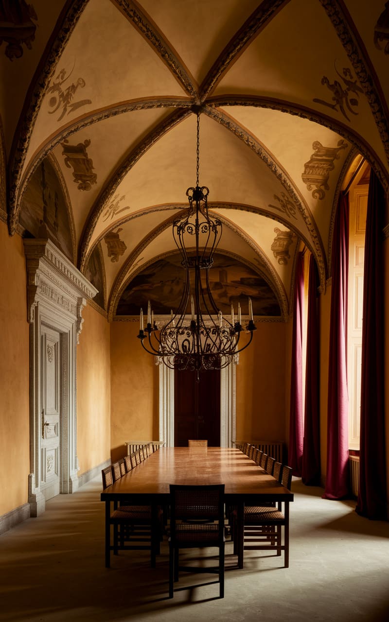 The grand dining hall, a whispered echo of Medici splendor, cradles a long, laden table under the watchful gaze of towering, teal velvet drapes. Each arched window, a portal to a muted world, frames the scene with solemn elegance. Heavy, tapestry-clad chairs, their backs a canvas of faded gold, stand sentinel, awaiting a feast where hushed conversation and the clinking of porcelain will dance in the room’s cool, curated shadows.