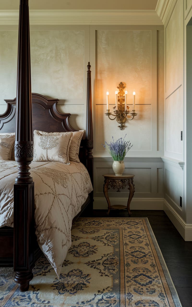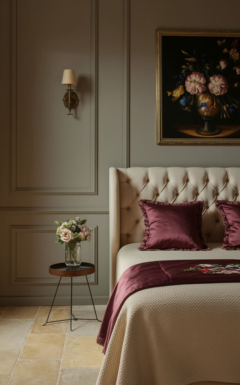 Bathed in the quiet luminescence of a wall sconce, this chamber whispers of a refined past, its panelled walls a muted canvas for a tufted headboard draped in creamy comfort. A splash of deep crimson in the pillows and runner echoes the rich hues of a floral still life, while a delicate posy rests on a slender table, its fragility a counterpoint to the room’s stately elegance, all hinting at a private world of whispered secrets and hushed repose.