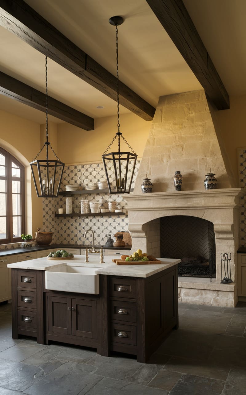 37. Renaissance-Inspired Kitchen with Suspended Lanterns and Hidden LED Accents