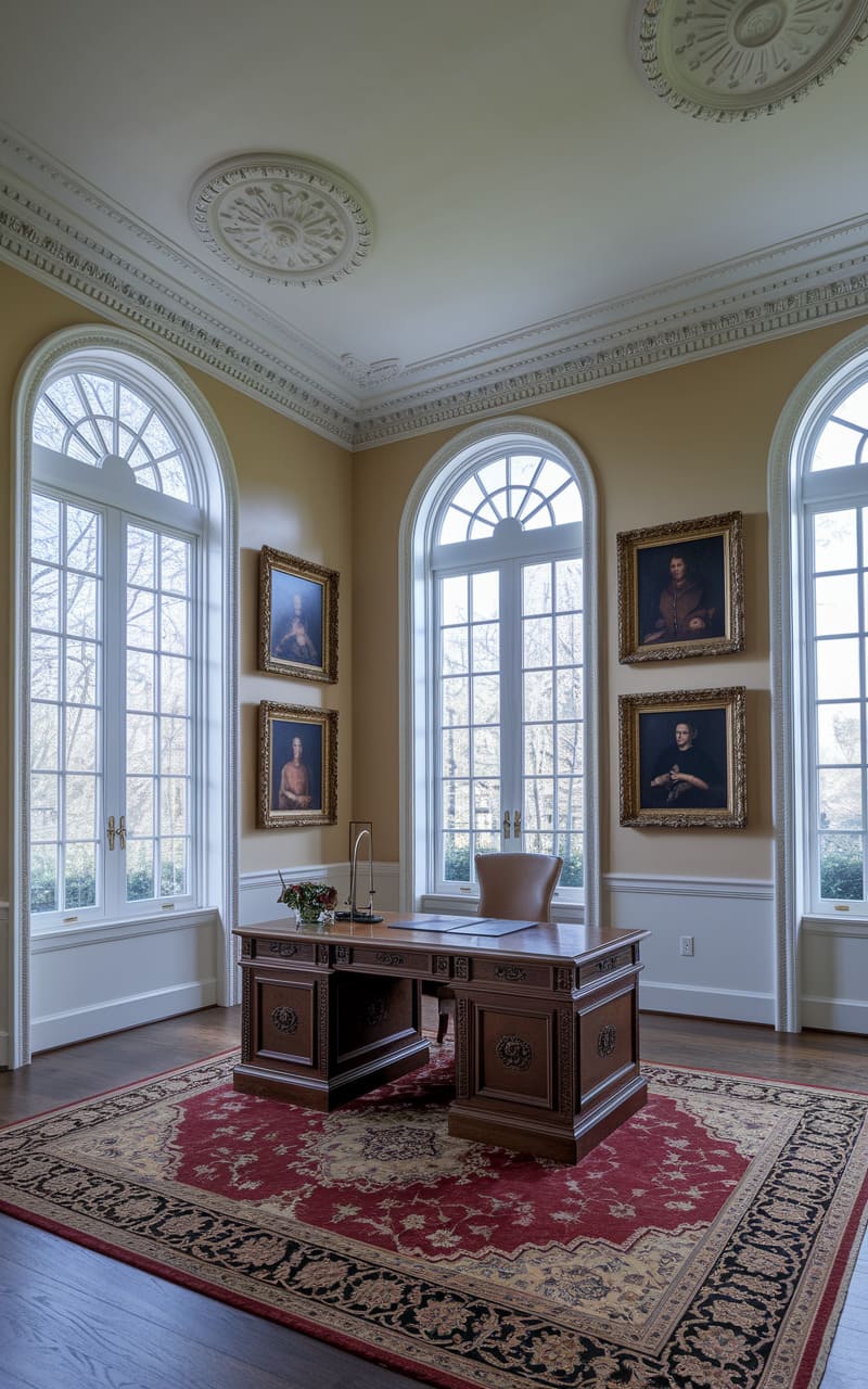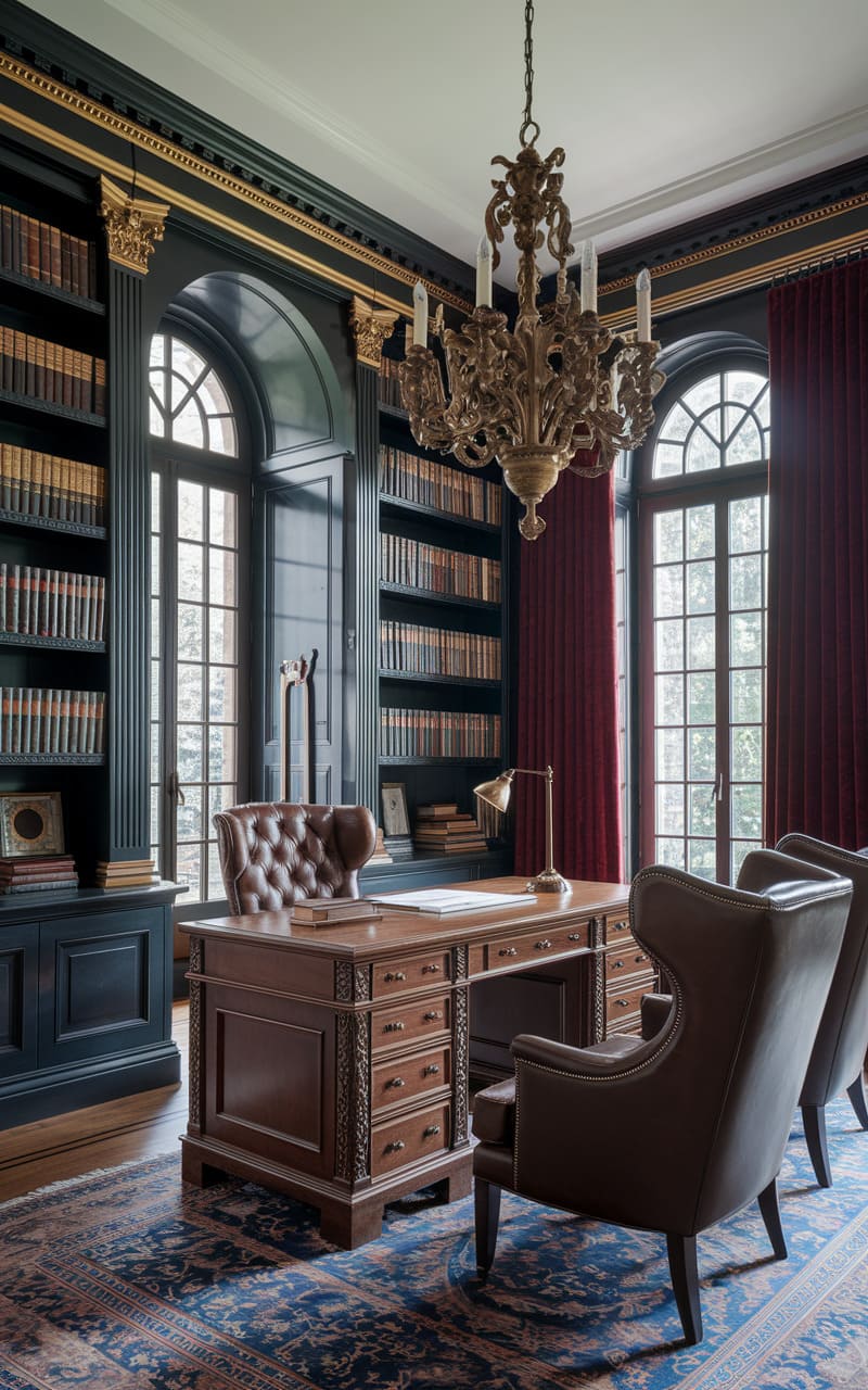 A scholar’s refuge, the room hums with the silent weight of knowledge, its walls lined with leather-bound tomes whispering secrets of ages past. The deep tones of the painted woodwork frame arched windows, their glass panes reflecting the soft luminescence of a chandelier, while a grand desk, scarred with the marks of countless hours, stands ready to cradle new ideas, the plush leather chairs awaiting the return of a mind lost in thought.