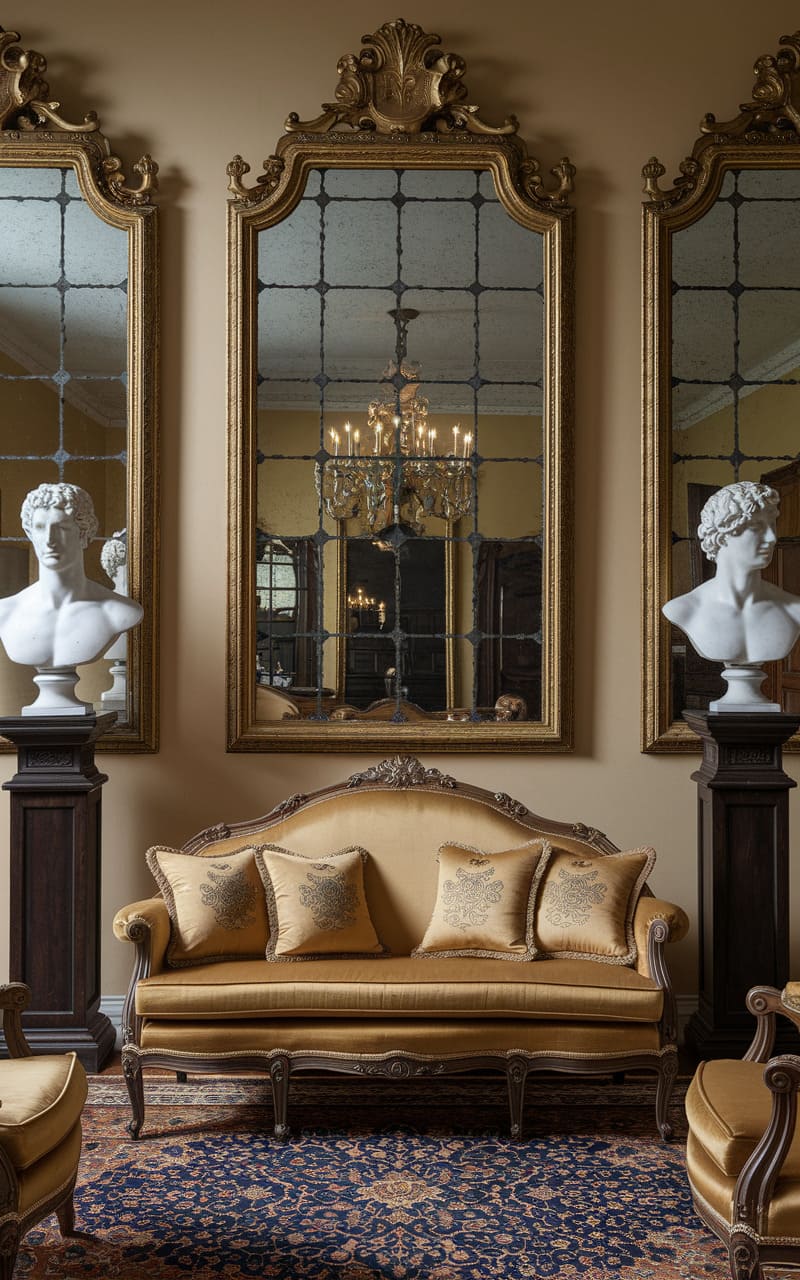 A golden hush fills this room, where three tall, antique mirrors, each fractured into smaller panes, reflect a chandelier’s soft shimmer and multiply the space into an illusion of infinite depth. A plush, mustard-yellow settee, adorned with embroidered cushions, anchors the composition, its ornate frame echoing the gilded extravagance of the mirrors. Flanking the settee, dark plinths elevate marble busts, their serene gaze fixed on a distant era, while a richly patterned rug whispers tales of forgotten footsteps, creating a scene that feels both grand and intimately personal, like a stage set awaiting its players.