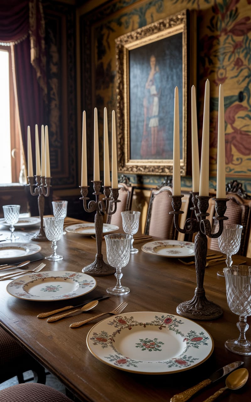 102. Elegant Dining Room with Ornate Candelabras and Hand-Painted Ceramic Plates
