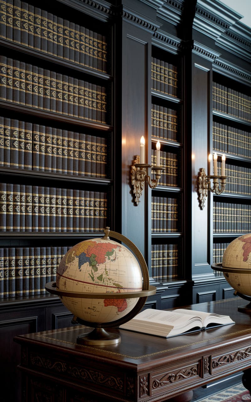 103. Refined Home Library with Antique Globes and Leather-Bound Books