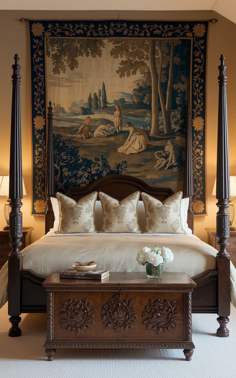 104. Romantic Bedroom with Tapestry Wall Hangings and Hand-Carved Wooden Chests