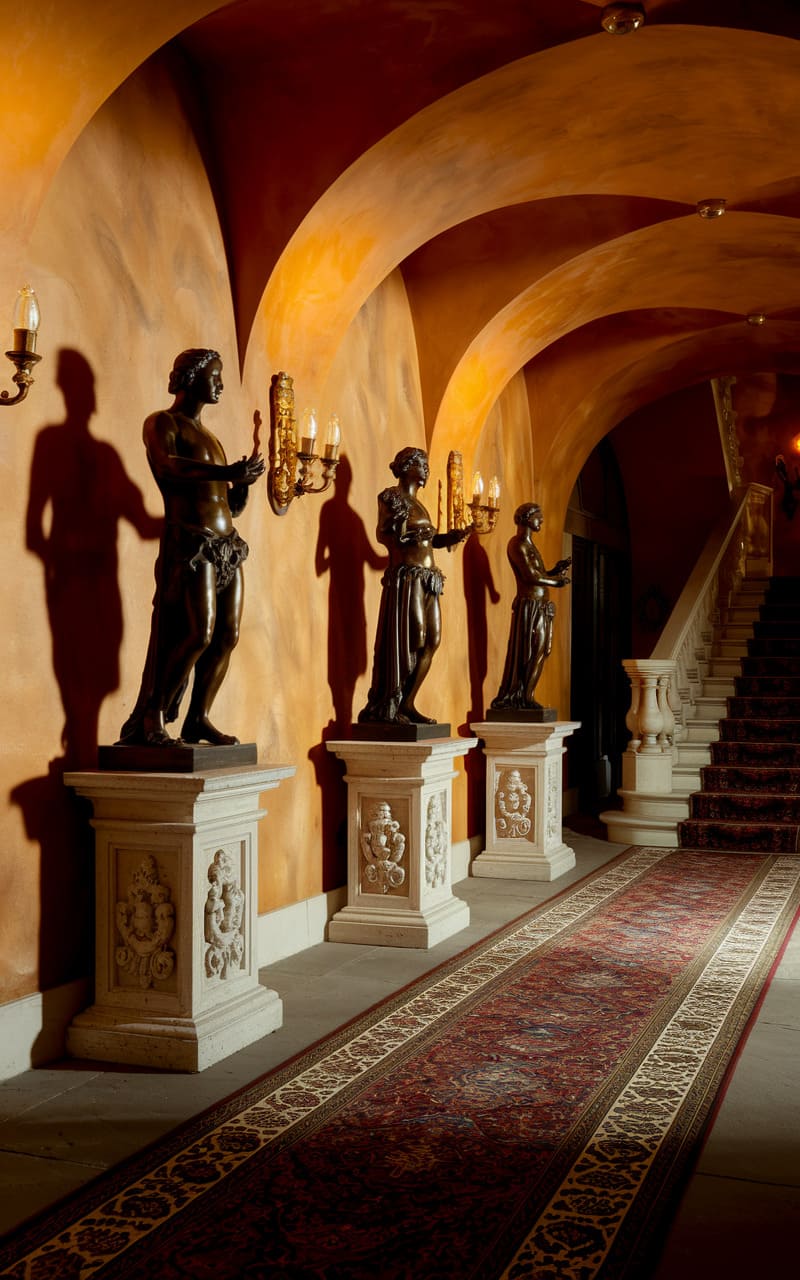 Beneath the warm, ochre glow of the arched passage, bronze figures stand sentinel, their forms echoed in the elongated shadows cast by flickering sconces. The air hums with the weight of history, each statue a silent guardian presiding over the faded grandeur of a richly patterned carpet that stretches towards a grand, ascending staircase. It’s a space where time seems to fold in on itself, a stage set for whispered secrets and the timeless drama of a bygone era.