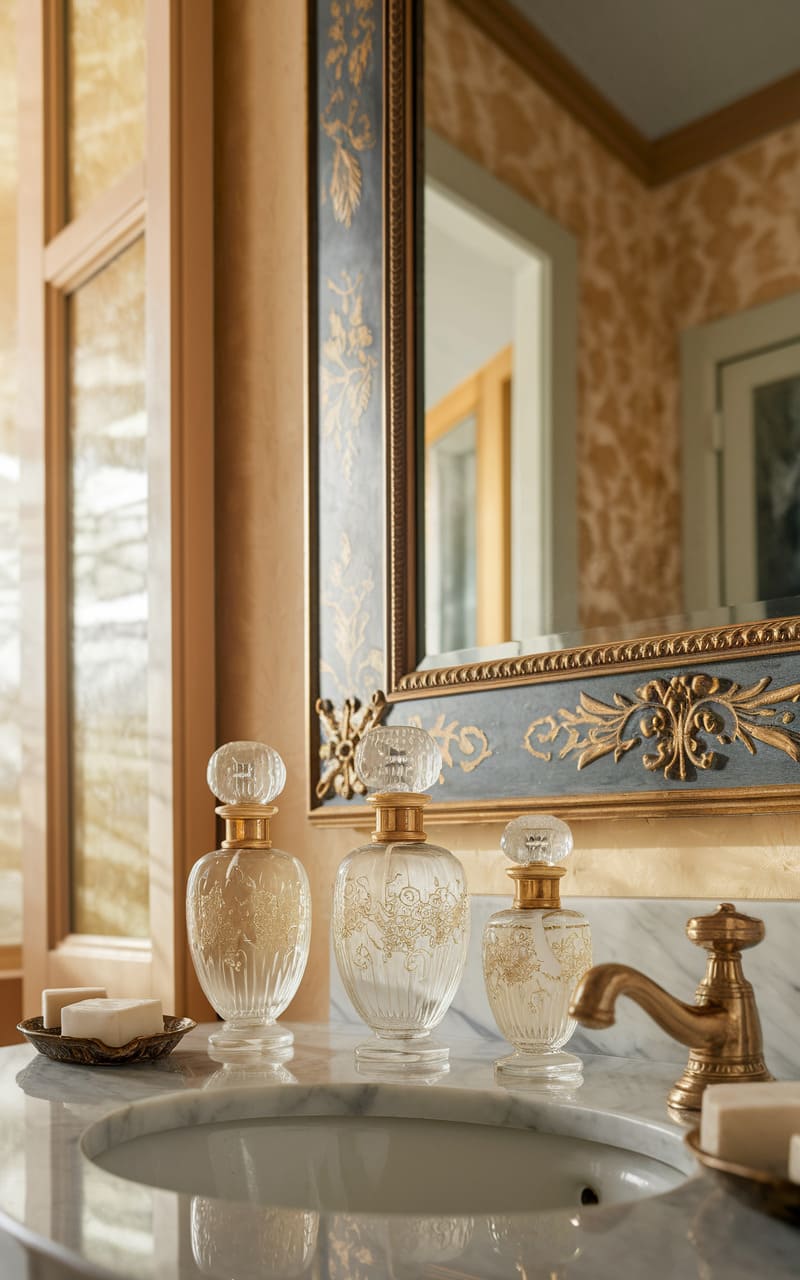 106. Luxurious Bathroom with Renaissance Perfume Bottles and Etched Glass Vanity Accessories