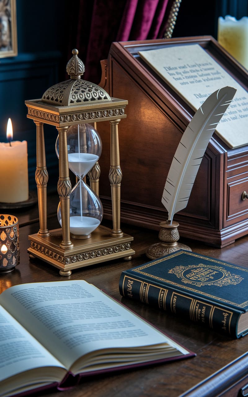 107. Sophisticated Study with Ornate Hourglasses and Quill-Ink Writing Set