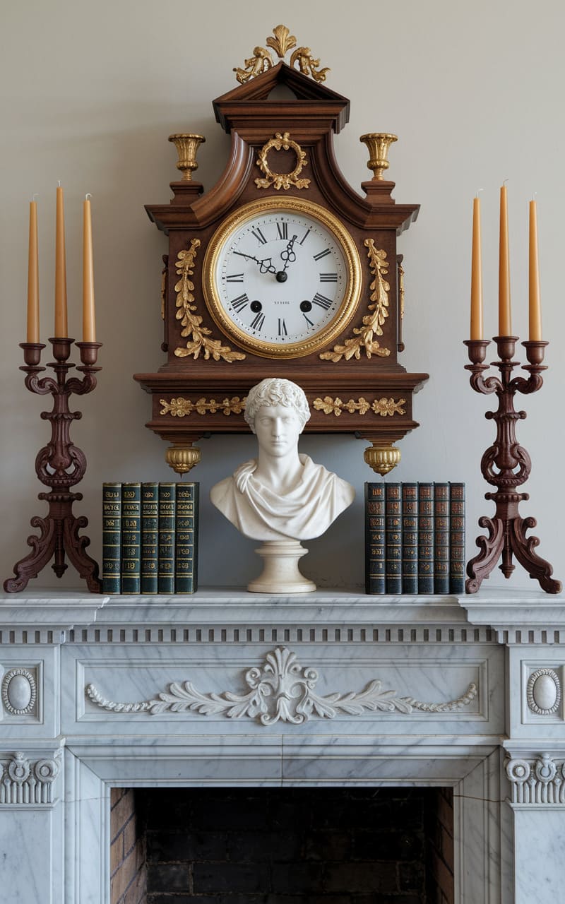 A hushed grandeur fills the room, where a marble mantel, cool and smooth beneath unseen illumination, displays a curated tableau of history. A stoic bust, carved from a stone that whispers of ancient forums, anchors the composition, flanked by the leather-bound spines of forgotten tomes. Above, a clock, its hands frozen in a moment of bygone elegance, ticks inaudibly, while slender candles in ornate holders stand like silent sentinels, casting a soft, warm glow that dances upon the intricate details of the room, a whispered homage to a Renaissance salon.
