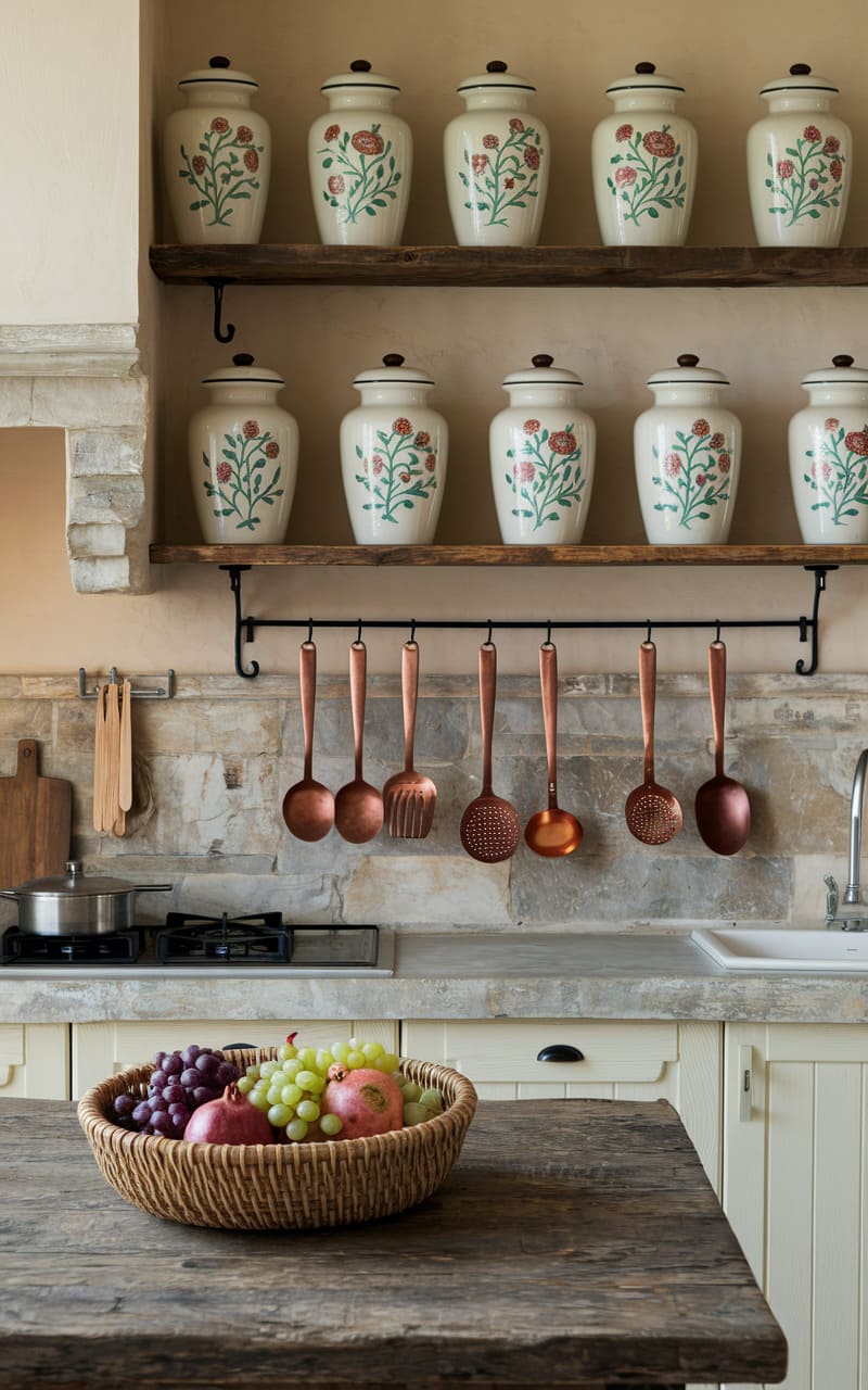 Step into a rustic kitchen where time seems to slow, the chipped stone walls whispering tales of countless meals prepared with loving hands. Rows of matching ceramic jars, adorned with delicate floral patterns, stand like silent guardians on rough-hewn wooden shelves, while copper utensils hang patiently, ready for their next culinary dance. A weathered table, laden with a basket of ripe fruit, anchors the space, its sturdy surface a testament to generations of shared moments and the simple, honest beauty of a life lived close to the earth.